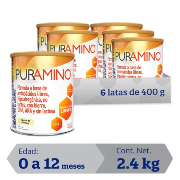 Fórmula infantil elemental, 100% a base de aminoácidos libres, diseñada para lactantes y niños con alergia severa a la proteína de la leche de vaca (APLV) o alergias alimentarias múltiples que no responden a fórmulas hidrolizadas. Puramino es una solución nutricional segura, libre de lactosa y fácil de absorber.
