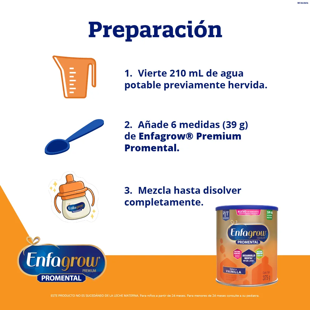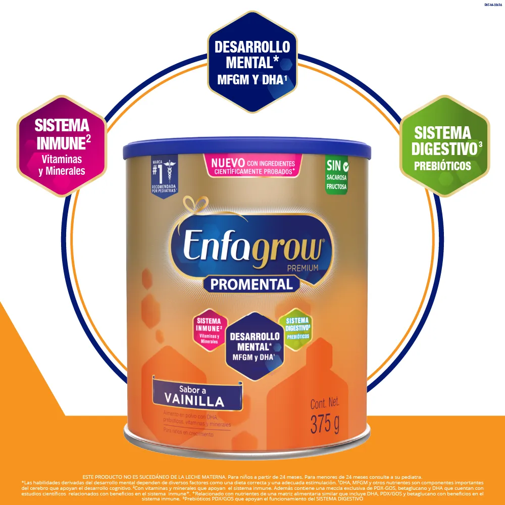 Porque el 85% del cerebro se desarrolla en los 5 primeros años (Curvas de Scammon) y durante esta etapa, una alimentación adecuada y tu estimulación son claves para apoyar el desarrollo mental* de un niño. Enfagrow® Premium tiene ingredientes como el DHA, MFGM, hierro, vitaminas y minerales que ayudan a complementar su dieta diaria.