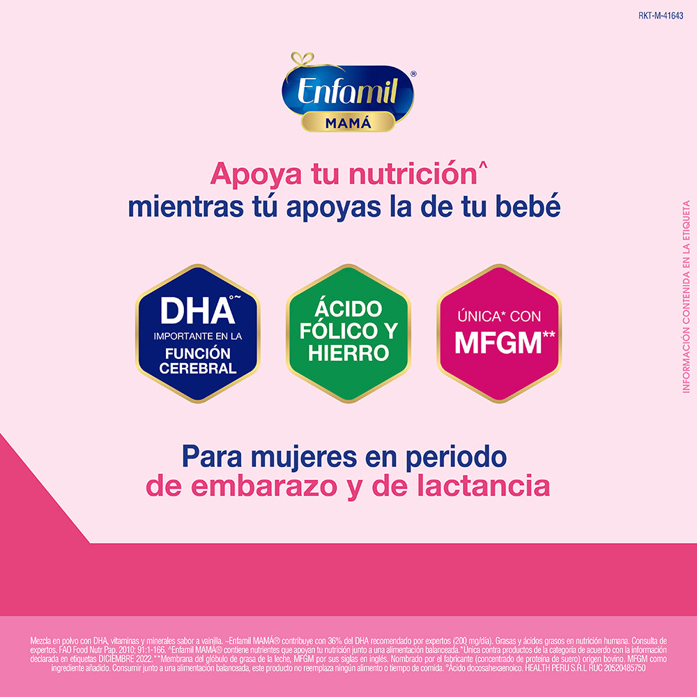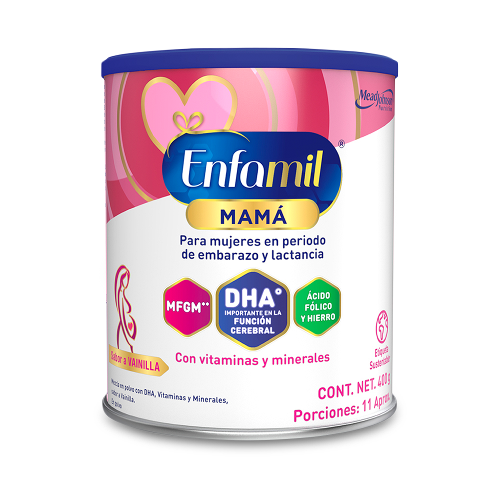 Enfamil Mamá es una mezcla en polvo con sabor a vainilla que aporta nutrientes importantes en el periodo de embarazo y lactancia como DHA, Ácido fólico, Hierro, Vitamina D y Calcio.