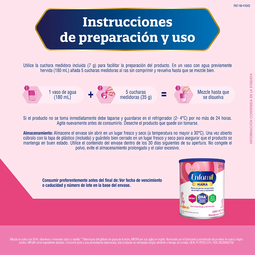 Enfamil Mamá es una mezcla en polvo con sabor a vainilla que aporta nutrientes importantes en el periodo de embarazo y lactancia como DHA, Ácido fólico, Hierro, Vitamina D y Calcio.