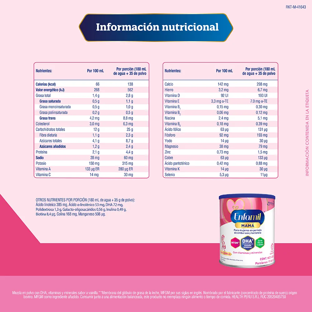 - Maltodextrina, leche estandarizada, fibra dietaria (polidextrosa (PDX), galacto-oligosacáridos (GOS), inulina), aceites vegetales*, lactosa, ácido docosahexaenoico (DHA), saborizantes (natural a leche, natural y artificial a vainilla), lecitina (emulsionante, SIN 322i), concentrado de proteína de suero**, palmitato de ascorbilo (antioxidante, SIN 304) e hidróxido de potasio (regulador de la acidez, SIN 525). MINERALES: carbonato de calcio, fosfato de magnesio, citrato de potasio, fosfato de calcio, sulfato ferroso, óxido de magnésio, sulfato de zinc, sulfato de manganeso, gluconato de cobre y selenito de sodio. VITAMINAS: bitartrato de colina, vitamina E, vitamina C, niacinamida, vitamina A, vitamina D3, biotina, vitamina K, pantotenato de calcio, clorhidrato de tiamina, clorhidrato de piridoxina y ácido fólico.CONTIENE: LECHE, LACTOSA, SOYA* (*Aceite de soya, el cual es libre de alergenos por ser altamente refinado) Y DERIVADOS DE PESCADO.
