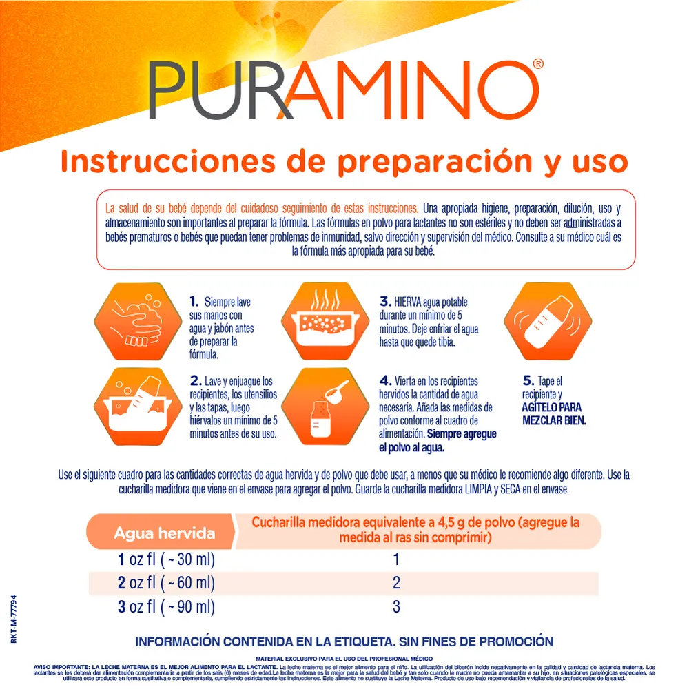 Sólidos de jarabe de maíz, aminoácidos esenciales (L -leucina, lisina, L -valina, L -isoleucina, L-treonina,L-tirosina, L -fenilalanina, L-histidina, L -cistina, L-triptófano, L -metionina), aceite de girasol alto oleico, aminoácidos no esenciales (L -aspártico, L -prolina, L -alanina, glutamato monosódico, L -serina, L-arginina,